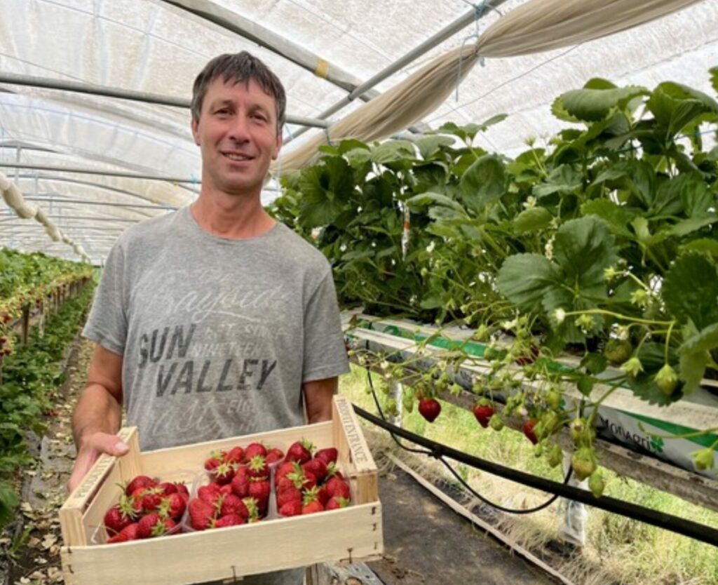 1991 : je m’installe avec mes parents sur une exploitation de 110 ha partagée entre une culture céréalière pour vendre et une production de cerises, en déclin. Au fil des années, nous nous orientons vers la fraise de qualité pour remplacer les cerises. Atout majeur : la proximité de Poitiers ! Offrir des fruits les plus frais possible est essentiel pour nous. Donc, cueillette le matin, livraison dans la foulée. Et… dégustation possible dans la journée !