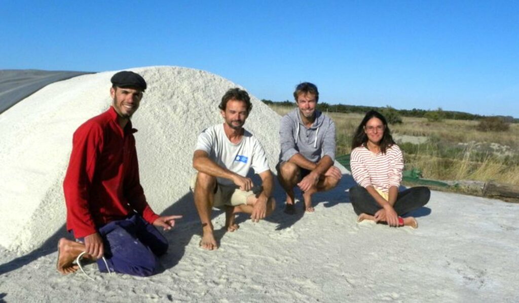 Les deux pieds dans les marais salants depuis 2000, Benoît apprend le métier sur le marais d’Olonne et Matthieu, du côté des marais de la Vie à Saint-Hilaire de Riez. Anne officialise son installation en 2018 ; puis Damien nous rejoint en 2021. Passionnés de milieux naturels, nous vivons aujourd’hui de nos soixante aires salantes, répartis sur 3,5 ha de marais, et récoltons chaque année gros sel, fleur de sel, et salicorne. Nous élevons aussi soixante-cinq brebis de race « Landes de Bretagne » sur quarante-cinq ha de prairies en espaces naturels